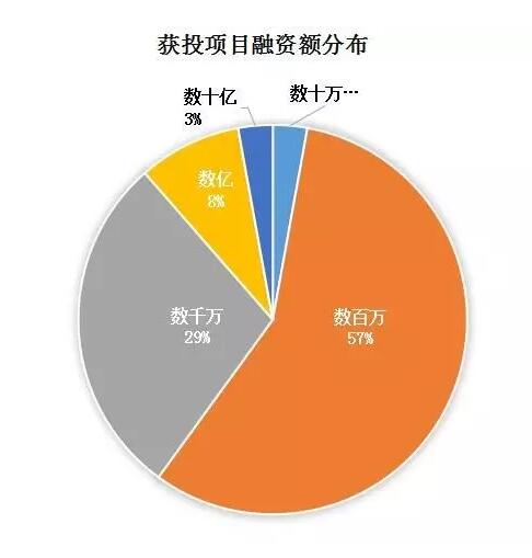 获投金额主要集中在数百万和数千万区间,分别占比57%和29%。