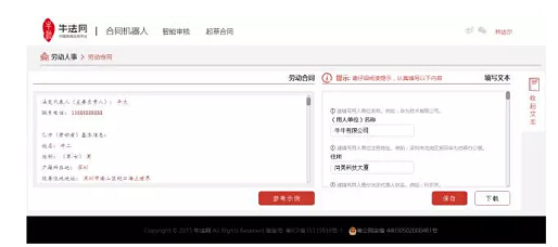 智能生成:除了审查外,机器人还可以智能生成常用的劳动人事类合同协议,用户只要输入一些必要信息,马上就生成劳动合同、知识产权和保密协议、竞业限制协议书、劳动合同解除协议书、劳动合同终止协议书、人才推荐服务协议书等。