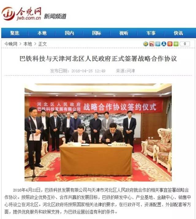 2016年4月22日,巴铁科技曾与与天津市河北区政府签订战略合作协议,巴铁的研发中心、产业基地、金融中心、销售中心将设立在河北区。河北区政府将为巴铁运营创造有利的条件。但此后,河北区政府从未就此事进行过任何回复。