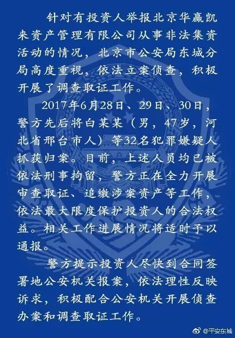 根据北京市公安局东城分局发布的消息,针对投资人举报北京华赢凯来资产管理有限公司从事非法集资活动的情况,东城分局依法立案侦查, 在2017年6月28日、29日、30日,先后将白志明等32名犯罪嫌疑人抓获归案。