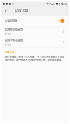 睡眠板块是配合就寝时间提醒功能一同使用的,开启了就寝时间提醒功能后,我们可以在其中设置睡眠时间与起床时间,不同于手机的闹钟设置,该功能仅作提醒使用,当时间处在就寝时间时,手机屏幕上方便会出现睡眠提醒,敦促我们提早进入梦乡。而在就寝功能里,健康关怀还附有小贴士,提醒大家良好睡眠的重要性。