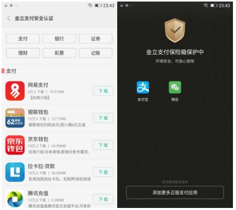 目前,手机联网的入口众多,安全性不明的wifi网络,以及浏览器中的不安全网站,都可能让支付、金融类正版APP间接被木马感染。为此,在金立M6S Plus中,大家可以时时更新病毒库,加强病毒防范意识。此外,金立还加入了支付保险箱,在这款APP中,我们下载的包括微信、支付宝在内的APP都会被安全保护,并实时监测其安全性,让木马没有机会趁虚而入。而在该APP中,包括支付、银行、证券、理财、彩票、记账类的应用都应有尽有,这些APP都经过了金立的官方认证,让用户可以安心的下载使用。