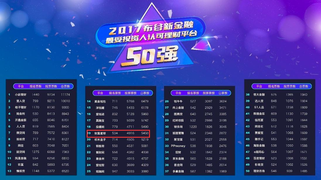 布谷新金融年度50强榜单,是针对全国数千家互联网理财平台进行评选,是行业内首份完全由投资人自主投票产生的排行榜,是广大投资人理财体验和内心感受的最直观呈现。作为10万投资人直接投票评选出来的网贷平台,财富星球连续两年脱颖而出,代表了平台的受欢迎程度。