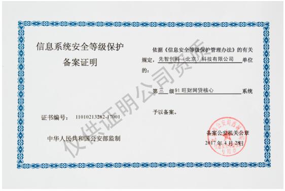 2017年4月28日,91金融旗下91旺财正式通过国家“信息系统安全等级保护”测试,获得公安部核准颁发国家信息安全等级保护备案证明三级证明,安全标准达到国家非银机构最高评级,成为《网络借贷信息中介机构业务活动管理暂行办法》正式出台后,在网络信息安全方面完成信息系统定级备案的平台之一。