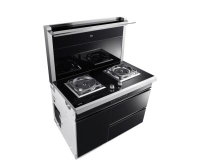 原来两个男士是安装工人,他们把纸箱抬进厨房,把我刚清洁过的灶台给拆了,看得我一脸懵逼。然后,他们把写着红日E家的纸箱打开,我一看,哈,是烟灶一体机!通体都是不锈钢和钢化玻璃,感觉很美观。他们准备安装这玩意儿,我指定了个位置问安装这里方便吗?其中一个男士说非常方便,这是四合一的红外线集成灶,一机多能,不占空间,灶的两侧都配有燃气和电源接口,排风管、气、电、排烟管位置均可以互换。