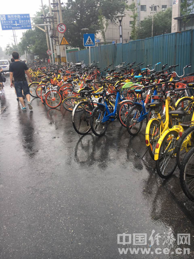 陶然亭地铁站附近的道路上,共享单车大方的停在非机动车道上,为雨后的北京平添几分不便。 中国经济网 甄红南/摄