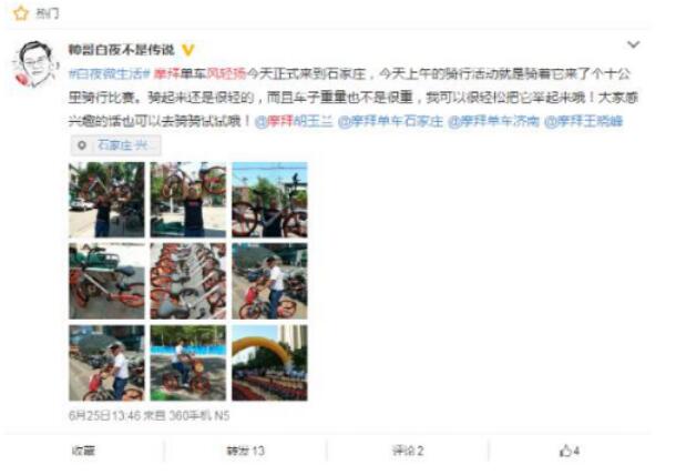 网友“帅哥白夜不是传说”:摩拜单车风轻扬今天正式来到石家庄,今天上午的骑行活动就是骑着它来了个十公里骑行比赛。骑起来还是很轻的,而且车子重量也不是很重,我可以很轻松把它举起来哦!大家感兴趣的话也可以去骑骑试试哦!