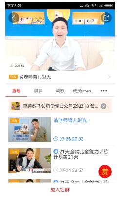 2016年,翁亦奇正式借助掌门号开启自己的直播教育创业路。凭借此前积累的经验,“至善教子父母课堂”推出的课程能迅速抓住用户的内心需求,可读性很高。而且直播中翁亦奇还会打开4方连线功能同时与3个不同地区的学员一起交流心得,而学员遇到不明白的问题则可在社群中发起询问,这种强互动式授课加强了社群间的凝聚力。