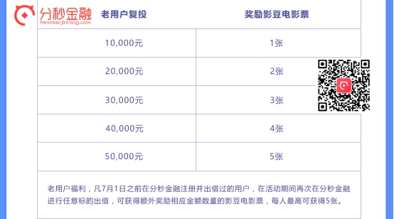 凡7月1日之前在分秒金融注册并出借过的用户,皆可参加活动,活动期间进行任意标的出借,最高可获得5张电影票!