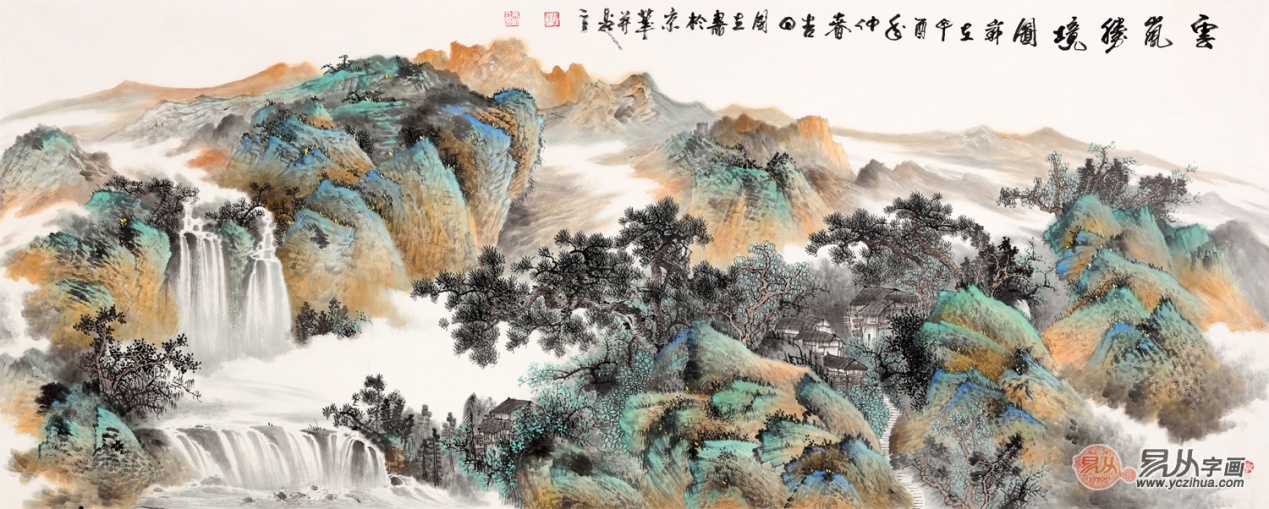 著名山水画家马国立六尺横幅国画作品《云岭翠暖图》作品来源:易从网