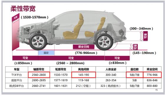 此外, T1X平台相对竞争品牌车型,更具备柔性带宽的优势。例如,T1X平台的轴距带宽在2560-2800mm之间,离地间隙145-190mm之间,乘坐空间可根据不同需求灵活运用,能够生产5-7座车型,达到目前自主品牌平台的最高水平。