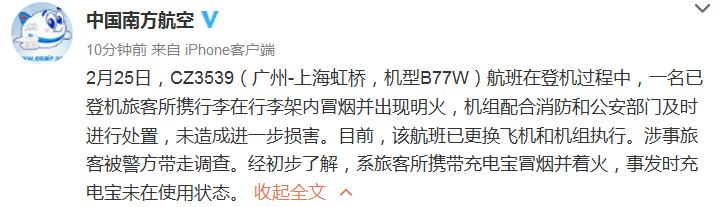 人民网北京2月26电(记者 毕磊)2月25日,南航CZ3539(广州-上海虹桥)航班在登机过程中,一名旅客所携行李中的充电宝冒烟并起火,所幸很快被机上乘务员和乘客扑灭。