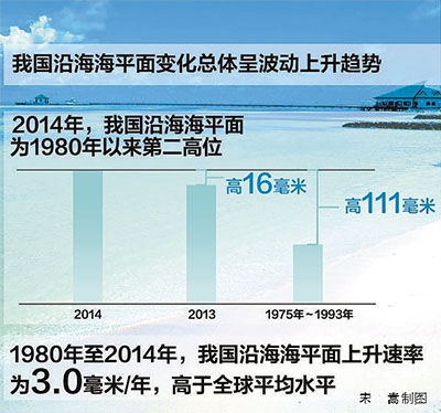 公报还显示,2014年,我国沿海海平面较常年(1975年—1993年)高111毫米,较2013年高16毫米,为1980年以来第二高位。自上世纪90年代以来,我国沿海海平面上升明显。