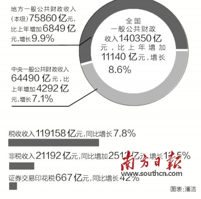 其他值得关注的数据还有,2014年,全国非税收入21192亿元,同比增加2513亿元,增长13.5%;同期证券交易印花税667亿元,同比增长42%。“主要受去年后两个月股市成交额大幅增长带动。”财政部分析。