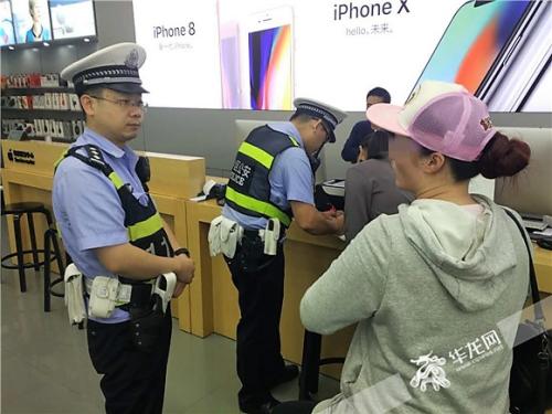 一名民警与消费者沟通,另一名民警向手机店工作人员小霍了解情况。记者 张勇 摄