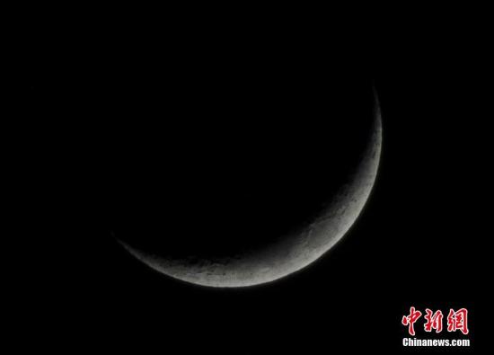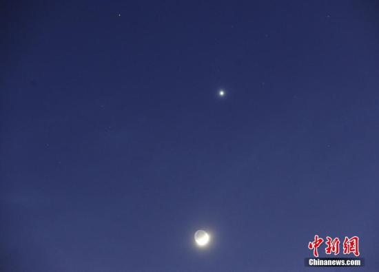 2017年1月31日傍晚在大连市拍摄的“双星伴月”天象。当晚,金星、火星和月球同时出现在我国夜空中。弯月像一条小船漂荡在西南方深蓝色的天幕之上。 中新社发 刘德斌 摄 图片来源:cnsphoto