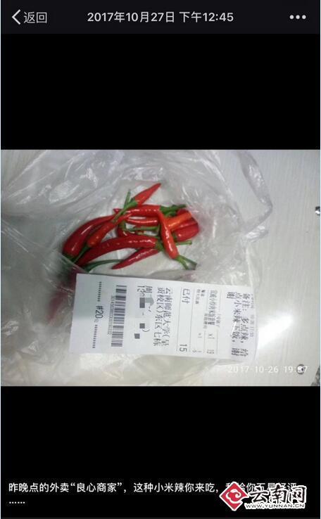 10月26日下午19点左右,云南师范大学大三的周同学打开外卖软件,在一家小吃店点了一份宣威小炒肉套饭,在付款时他习惯性备注了一句“多点辣,给点小米辣下饭,谢谢。”没想到收到外卖后打开一看,里面放着15个新鲜未经处理的红色小米辣,这让周同学哭笑不得,这简直无法下口。“难怪外卖员给我餐盒的时候问我是不是这种辣椒,我没听清就含糊答应了,没想到给了那么多新鲜小米辣,其实我想要的是那种腌制过的。”