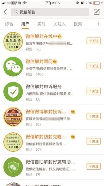 这种不放心,在购买“微信解封”服务的被封者里也不少,多名寻求“微信解封”服务的被封者告诉北青报记者,自己找了团队,交了钱,但是微信并没有被解除限制使用,回头找团队却已经被拉黑了。阿树也坦陈,“微信解封”圈子里骗子团队也很多,“基本上就可以说一半一半吧。”