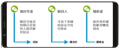 “微信被封的时候,我整个人都慌了,我正聊着一单生意呢!”经营一家护肤品网店的陈女士称。,近,不少微商的微信账号由于频繁添加好友,密集营销行为等原因频频遭到微信官方的封禁。北京青年报记者调查发现,微商被短期封号到期后,往往需要好友验证才能解封,而提供验证成为不少“微信解封”商家淘金的门道。
