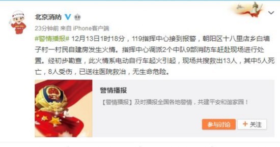 人民网北京12月13日电 据北京市公安局消防局官方微博消息,12月13日1时18分,119指挥,接到报警,北京市朝阳区十八里店乡白墙子村一村民自建房发生火情。指挥,调派2个中队9部消防车赶赴现场进行处置。经初步勘查,此火情系电动自行车起火引起,现场共搜救出13人,其中5人死亡,8人受伤,已送往医院救治,无生命危险。