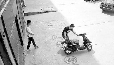 摩托车店门口的监控画面:14时32分,年轻人从地上捡起一个细长物体,用它摆弄门锁。