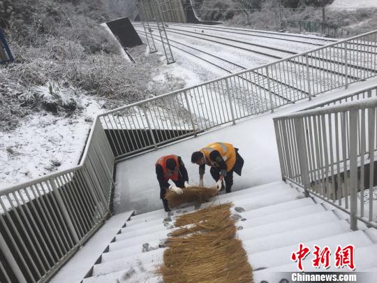 1月4日,宜万铁路齐岳山站铁路职工铺设防滑草垫。 钟欣 摄