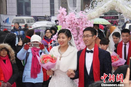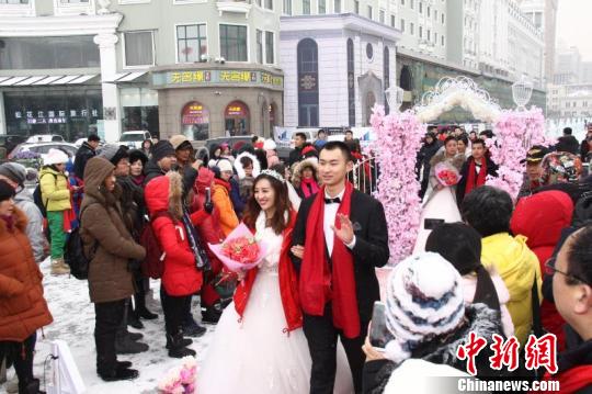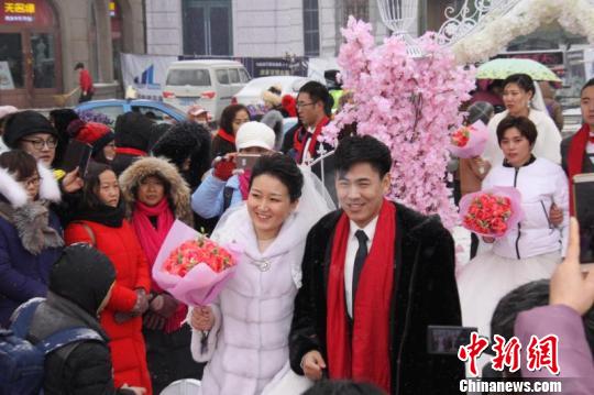 中新网哈尔滨1月8日电 (记者 杨拓)8日,哈尔滨,大街防洪纪念塔广场上人头攒动,伴着婚礼进行曲的音乐,34对驻哈部队和社会各界的新人在广场上举办集体婚礼。作为哈尔滨国际冰雪节系列活动之一,本届冰雪集体婚礼还有来自北京、江苏、山东、四川等14个省、市的17对新人,参与省份的数量创下历年之最。