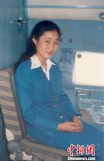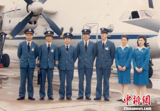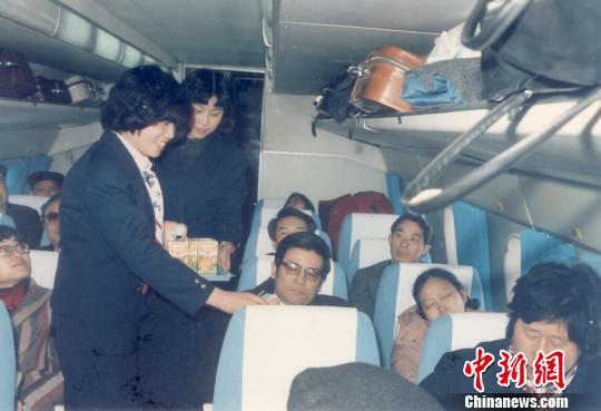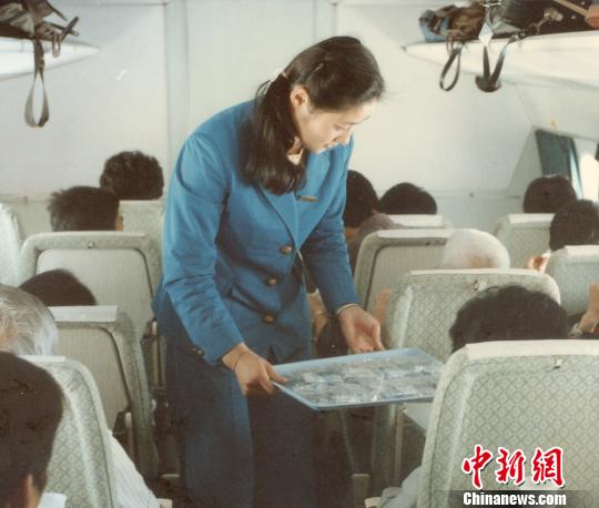 1987年,征海英乘务组在国产运七飞机上为旅客服务 徐宁 摄