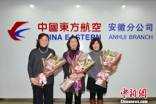 在东航安徽分公司举办的首批空姐退休座谈会上,客舱部员工代表为三位老同志献花,她们手捧鲜花合影留念。