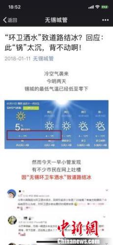 中新网无锡1月11日电 (记者 孙权)冷空气来袭除了让人觉得冷之外,还附带了一些其他“小麻烦”。11日晚间,无锡市城市管理局官方微信平台发布了题为《“环卫洒水”致道路结冰?回应:此“锅”太沉,背不动啊!》的文章,表示该局经调查后得知,因“天寒地冻”,无锡环卫部门今天未进行水冲作业。所以网传“无锡环卫车洒水”致道路结冰一事不属实。