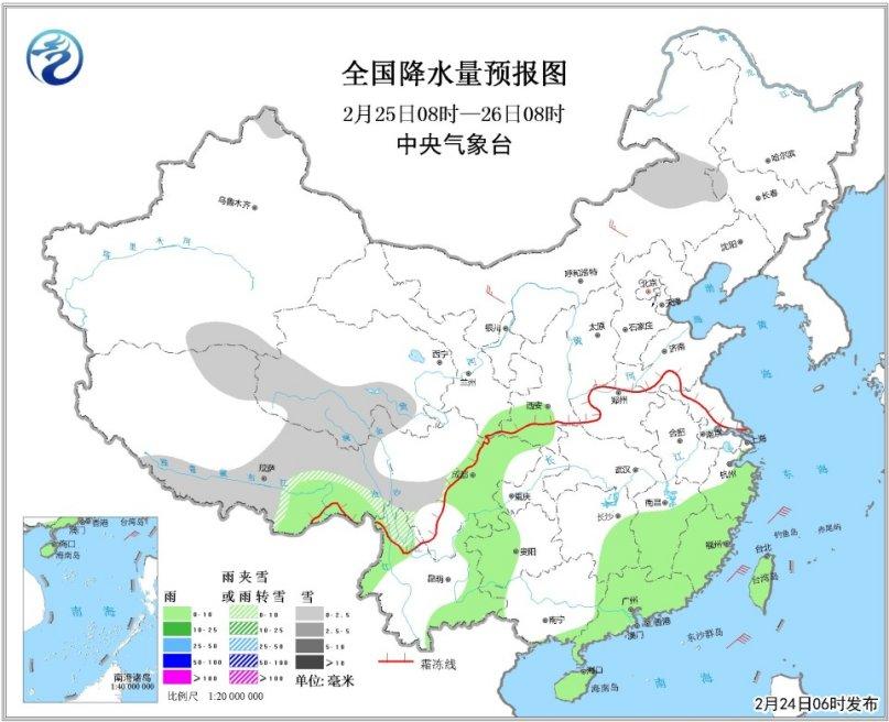 24至25日,西南地区东部、江汉、江淮、江南大部、华南等地有小到中雨。26日夜间起,南方地区将自西向东出现一次中到大雨过程。
