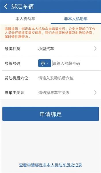 新规实施后,驾驶人绑定非本人名下机动车主要有线上线下两种途径。其中,线上途径为“交管12123”手机APP,只允许申请绑定本人名下车辆和1辆非本人名下机动车,且绑定的车辆需为小型汽车或小型新能源汽车。