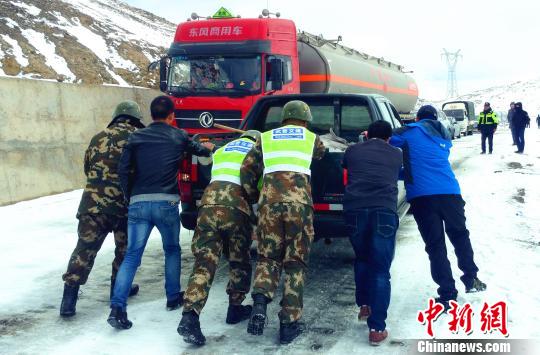 武警某部交通三支队驻左贡县中队官兵与现场人员一起疏通车辆 路凯 摄
