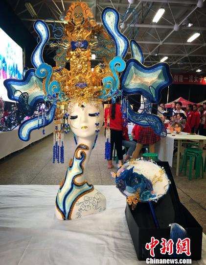 “作品整体是红色和金色结合,在头饰作品两边其实是欧式家具锯开后摆出的造型,这也是我的一个创意,它融合了传统与现代元素,展示出一种独特的设计,我希望能有更多人喜欢传统的中国风文化。”荣佳影说。
