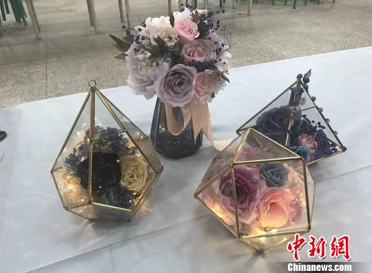 现场展出作品均为纯手工制作,每件作品耗时近一个月,造型包括古风、森系、海洋三大主题。 杨静 摄