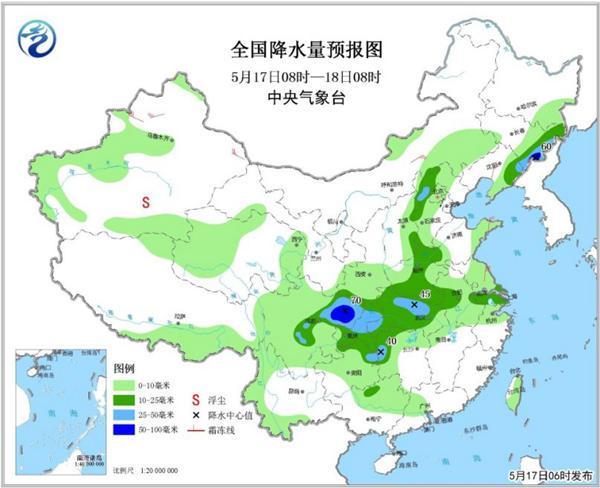 今天,北方强对流依旧活跃。与此同时,今天起,长江沿线及其以南地区降雨将逐步增多,西南、江淮、江南一带将逐渐出现明显降水。其中,今天降水将主要集中在四川盆地、重庆一带。,气象台预计,5月17日08时至18日08时,东北地区东南部、山西东部、河北西部、黄淮西部、四川盆地、江汉、江南东北部等地有中雨,其中,河北西部、四川中北部、重庆中北部、湖北北部等地的部分地区有大雨,局地暴雨;上述部分地区并伴有雷暴大风、短时强降水等强对流天气。