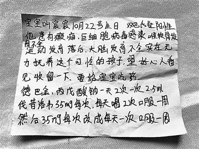在宸宸包里的纸条上,其父母还特别提醒要给孩子吃药,并且将服药的方法写得非常清楚。“要给宝宝吃药。德巴金(丙戊酸钠),两次,一次2.5毫升;伐昔洛韦每次喝35毫克,每天喝两次,口服一周后改成每天喝一次,每次35毫克,口服一周。”刘护士告诉北青报记者,孩子带的奶瓶、玩具球价格也不便宜,“看起来家庭条件还不错,父母也挺在意孩子的。”