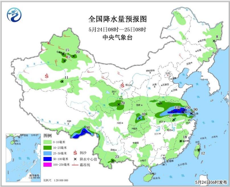 5月24日08时至25日08时,新疆北部、西藏东南部、西北地区东南部、四川盆地东北部、黄淮南部、江淮大部等地有中到大雨,其中安徽中北部、江苏中南部等地的部分地区有暴雨,局地大暴雨(100~150毫米),上述部分地区伴有雷电、短时强降水(30~50毫米,局地60毫米以上)、雷暴大风等强对流天气。新疆北部、甘肃西部、内蒙古西部等地有4-6级风,山口风力可达8~10级。新疆南疆盆地和内蒙古西部等地有扬沙或浮尘天气。