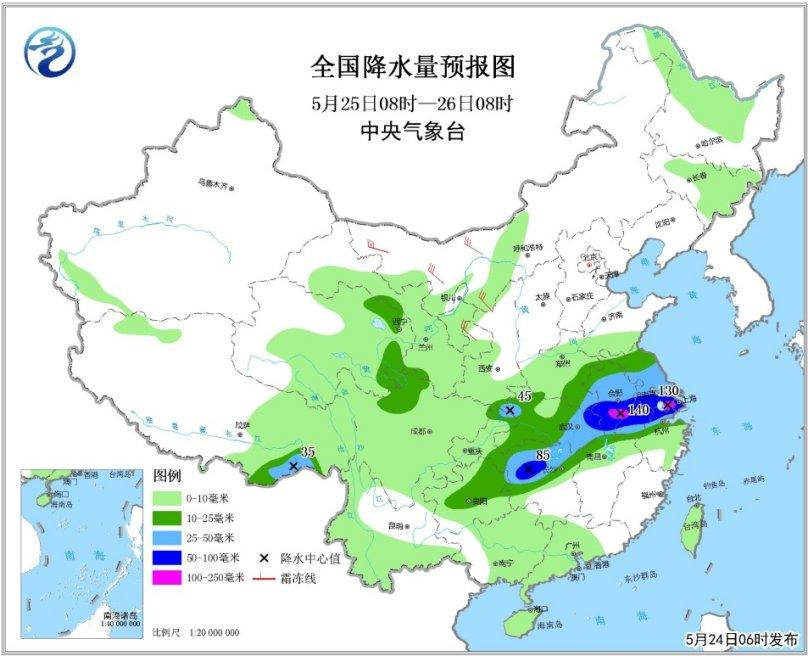 5月25日08时至26日08时,青海东部、川西高原北部、西藏东南部、西南地区东部、江汉、黄淮南部、江淮、江南北部等地有中到大雨,其中,湖南西部、江淮西部、江南东北部等地的部分地区有暴雨,局地大暴雨(100~140毫米),上述地区并伴有短时强降水等强对流天气。内蒙古中西部及河套地区等地部分地区有4~6级风。南疆盆地、内蒙古西部、河套西部等地有扬沙或浮尘天气。东海北部海域将有6~8级、阵风9级大风。