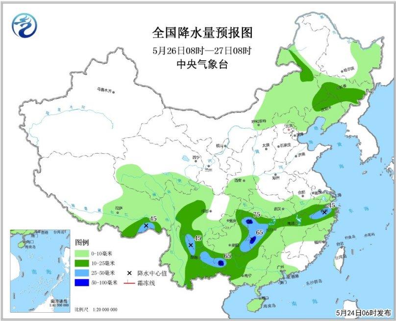 5月26日08时至27日08时,内蒙古东北部、东北地区中部、西藏东南部、川西高原南部、西南地区东部和南部、江南北部和西部、华南西部等地的部分地区有中到大雨,局部暴雨,上述地区并伴有短时强降水等强对流天气。内蒙古中西部及华北中北部等地有扬沙或浮尘天气。东海北部海域将有6~8级、阵风9级大风。