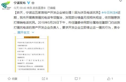 2018年5月29日下午,宁波市住建委会同部分属地住建部门约谈拨打骚扰电话的房产开发企业负责人,要求开发企业立即停止这一骚扰行为,责令其限期整改,并处以暂停网签、延缓发放预售许可证等相关处罚措施。