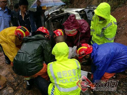 接110转警后,隆阳区消防大队立即出动1车7人前往施救。救援官兵赶到现场发现,现场一片狼藉,整个路面撒满车辆零部件,事故车辆车体被撞得严重变形,车辆驾驶室部位与山体紧紧贴在一起。事故车辆因弯道超车时车子打滑翻下50米左右深的山崖下面,所幸4名乘客轻微擦伤并安全脱险,由于巨大的撞击力,导致事故车辆驾驶员被变形的车身牢牢卡住,动弹不得,暂无生命危险。