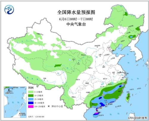 全国降水量预报图(6月5日08时-6日08时)