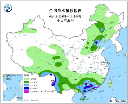 6月12日08时至13日08时,西藏东南部、云南西部、湖南南部、广西中东部、广东大部、海南岛北部等地有大雨或暴雨,其中,云南西部、广东北部和南部沿海局地有大暴雨(100~160毫米);上述部分地区并伴有短时强降水(,小时降水量70毫米),局地有雷暴大风。此外,12日午后至夜间,华北中北部、东北南部、内蒙古东部等地有雷阵雨,局地有雷暴大风或冰雹等强对流天气。为此,,气象台6月12日08时继续发布暴雨蓝色预警。