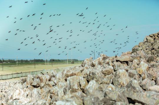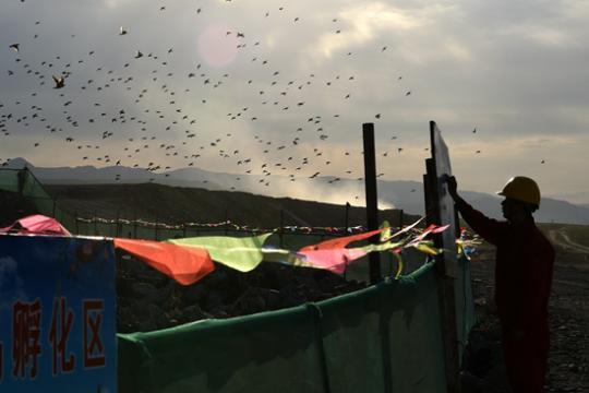 然而它们并没有很快飞走,到了5月底,反而纷纷落在在碎石堆上。每天早上姜东军去工地巡视,它们总会站在石头上高声啼叫,“跟开会一样”。工期只得一推再推,从开始的“一周”推到了一个月、两个月。
