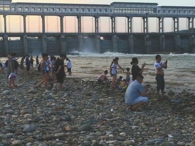 上方就是泄洪口,沙滩上的游人玩兴不减。