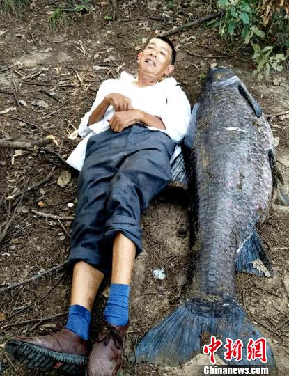 中新网孝感8月11日电 (宋俊初)近日,湖北孝感市孝昌县63岁居民鲁艳清在观音湖水库钓到了一条重达102斤的大青鱼,鱼身长达1.6米,接近一般成年人的身高。