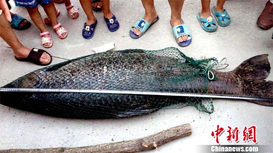 两人相互配合,与水中的大鱼“搏斗”一个半小时,终于将其拉到了岸边。,,三个人合力才将大鱼抬到岸上。这条大鱼是一条雌性青鱼,重达102斤,有人拿来卷尺,给青鱼量了一下长度,刚好1.6米。(完)