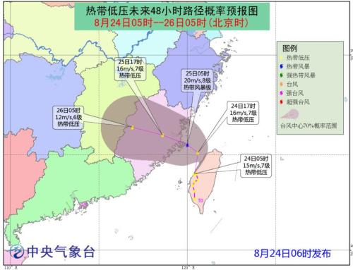 另外,台湾西部热带低压的,今天(24日)早晨5点钟位于台湾省彰化境内,就是北纬24.0度、东经120.4度,,附近,风力有7级(15米/秒),,,气压为994百帕。预计,该低压将以每小时10公里左右的速度向偏北转西北方向移动,有可能于24日夜间在福建沿海登陆(15-20米/秒,7-8级,热带低压或热带风暴级)。