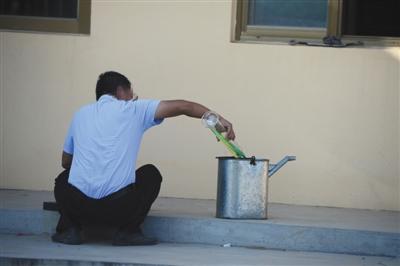 8月29日,定州382省道边一个无名停车场内暗藏着一个加油站,一名男子正在院内调配劣质燃油。